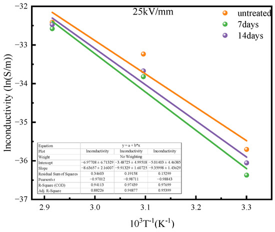 The logarithm of conductivity is found to be linearly dependent on the reciprocal of the Kelvin temperature, as described by the Arrhenius equation shown in Equation (4). The plot for 25 kV/mm is shown in Figure 9, and the conductance activation energy can be determined by calculating the slope of the figure. The symbols in Figure 9 are the experimental results, and the straight lines are fitting results.
