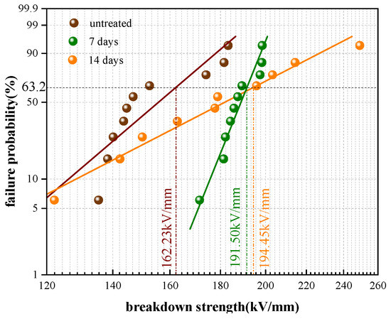 The breakdown voltages of XLPE films were found to increase with the aging duration time. The breakdown strength of the untreated XLPE was 162.23 kV/mm, and its Weibull shape parameter was 8.98. After 7 days of degassing treatment, the breakdown strength increased to 191.50 kV/mm, which is 18% higher than that of the untreated sample. However, the Weibull shape parameter was distinctly larger than that of the untreated film. After 14 days of degassing treatment, the breakdown strength increased to 194.45 kV/mm, while the shape parameter decreased to 5.43. This implies that longer degassing times can reduce the breakdown dispersibility and further improve the insulation stability of the XLPE material. The analysis of variance (ANOVA) method was also used in the study to estimate the breakdown strength of different XLPE samples. The average breakdown fields were 154.05 kV/mm, 187.62 kV/mm and 179.67 kV/mm for the XLPE samples with degassing times of 0, 7 and 14 days, respectively. The standard deviations were 18.4, 8.7 and 37.6 for the corresponding samples. The breakdown strengths calculated from the ANOVA method differed little from those obtained using the Weibull analysis method, which aligns with the breakdown mechanism of XLPE.