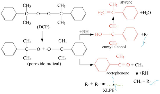 The peroxide crosslinking method used in cable manufacturing led to the generation of the by-product, as illustrated in Figure 11. The most commonly used cross-linker is dicumyl peroxide (DCP), which decomposes at high temperatures. There are two chemical reaction routes, both of which generate active free radicals that abstract hydrogen atoms from the polyethylene macromolecular chains, forming cross-linked bonds and promoting the reticulation of the structure. Two primary by-products, acetophenone and cumyl alcohol, are generated through these two reaction routes, along with other by-products such as α-methyl styrene, methane and H2O, etc. [12]. Methane is gaseous at room temperature and easily escapes from XLPE. The remaining by-products, such as acetophenone, cumyl alcohol and α-methyl styrene, are polar molecules that can dissociate under thermal stress. This dissociation barrier can be lowered under an applied electrical field. The charges released from this dissociation can strengthen the local electric field and reduce the insulating properties, affecting the insulation life of XLPE and threatening the operation of power cables. To minimize the amount of cross-linking by-products in the cable, XLPE cables are generally degassed by placing them in a high-temperature vacuum atmosphere [13].