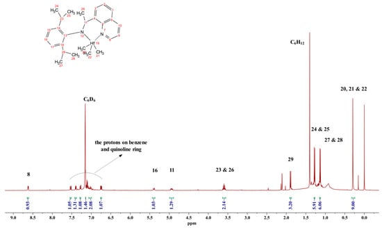 The 1H NMR spectrum of the metal complex Hf-1 is shown in Figure 2. As shown in Figure 2, the single resonance peak at 0.3 ppm is assigned to (CH3)3Hf, the resonance at 1.2–1.5 ppm corresponds to the hydrogens in the isopropyl group, the resonance peak at 1.4 ppm corresponds to the peak of impurity for cyclohexane hydrogens in deuterated benzene, the resonance peak at 3.52 ppm corresponds to the β-hydrogens in the isopropyl group, and the resonance peaks between 6.5 and 7.5 ppm correspond to the hydrogens in the quinoline ring. Notably, a quartet resonance at 4.95 ppm was observed and assigned to CH3CHN, while the resonance at 1.8 ppm was assigned to CH3CHN. This result suggested the migration of methyl and the formation of the amino group, similarly to previous reports involving imine-type ligands [24,33].