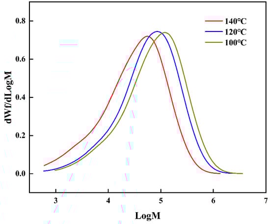The copolymerization temperature significantly impacts olefin polymerization activity, copolymer molecular weight, and comonomer incorporation. As shown in Figure 4 and Figure 5, the molecular weight of the copolymer gradually decreases with increasing temperature, and the molecular weight distribution broadens. As the reaction temperature increases, the copolymerization activity first increases and then decreases. In the 100–120 °C range, increasing temperature favors the rapid formation of catalytic active sites, significantly increasing the chain growth reaction rate. However, as the temperature continues to rise, the β-H elimination and chain transfer reaction rates also accelerate significantly. The combined effect of both reactions leads to a decrease in both catalytic activity and copolymer molecular weight.