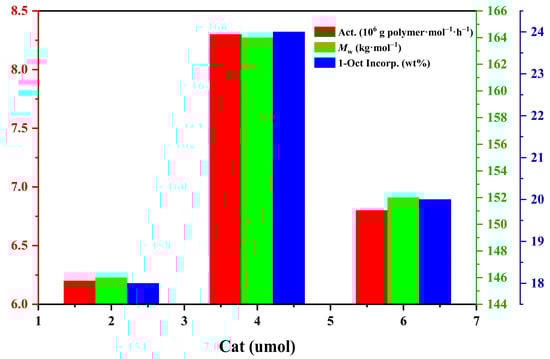 The effect of 1-octene molar concentration on copolymerization reaction activity, molecular weight, and comonomer incorporation by Hf-1 is shown in Figure 6. The initial amount of 1-octene feed is shown in Table S2. As the molar concentration of the comonomer increases, copolymerization activity gradually increases, exhibiting a typical comonomer effect [36,37]. The molecular weight of the copolymer and comonomer incorporation also gradually increase. However, when the comonomer molar concentration reaches 0.8 M, comonomer incorporation no longer increases significantly.