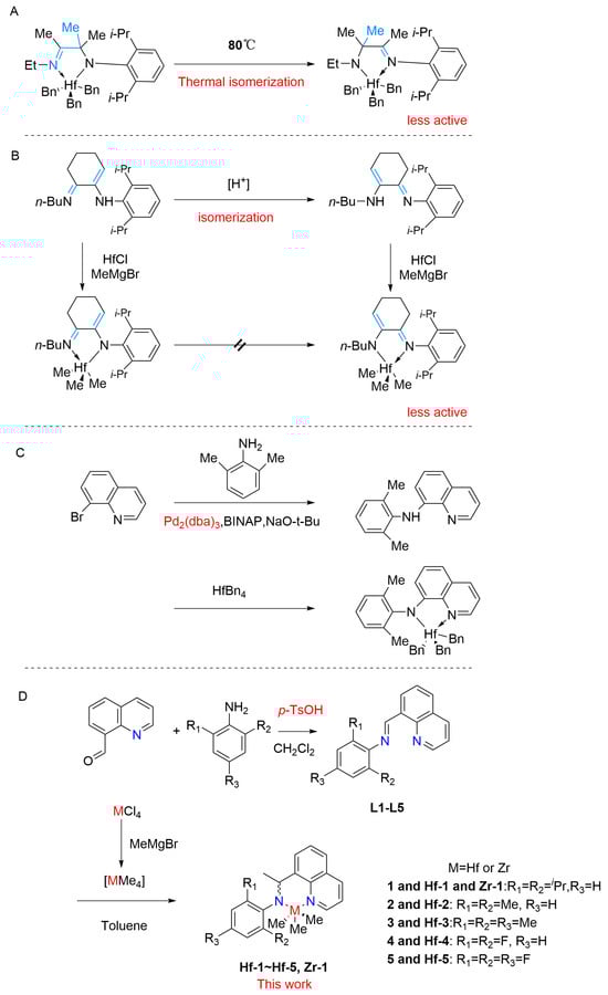 The industrial production of POEs employs high-temperature solution polymerization [8,9,10,11]. This method ensures that the copolymer does not precipitate during the reaction, maintaining a homogeneous reaction system. As a result, the obtained copolymer exhibits a uniform comonomer distribution and narrow molecular weight distribution. Consequently, the catalyst must possess excellent high-temperature stability to meet the requirements for this process. The catalysts used in industrial applications are typically constrained geometry catalysts (CGCs), which involve complex synthesis routes and high raw material costs [12,13,14,15]. In recent years, non-metallocene catalysts have gained widespread attention due to their simple synthesis and tunable ligand structures [16,17,18,19,20,21,22,23,24,25]. Among them, [NN] bidentate ligand metal complexes have demonstrated excellent high-temperature stability, showing great potential for industrial application. Klosin found that imine-amino Hf catalysts exhibit high polymerization activity and excellent copolymerization performance. However, further studies have shown that these catalysts are thermodynamically unstable and tend to undergo 1,2-methyl rearrangement to form more thermodynamically stable metal complexes. The polymerization activity of these transformed metal complexes is significantly reduced (Scheme 1A) [26,27]. These researchers designed a more thermodynamically stable imine-ene-amino Hf catalyst to address this issue using DFT calculations. This metal complex does not undergo rearrangement at high temperatures. However, further studies revealed that although the metal complex does not undergo rearrangement, its ligands undergo rearrangement under acidic conditions, resulting in a new metal complex with significantly reduced polymerization activity (Scheme 1B) [28,29]. The quinoline-amino catalyst was subsequently further developed. This catalyst features a simple synthesis route, and the resulting metal complexes are relatively stable. However, an important issue is that the synthesis process involves an expensive metal Pd catalyst, limiting its potential for large-scale industrial production (Scheme 1C) [30,31,32].