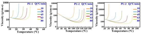To ensure that the simulation results align closely with experimental outcomes, material selection is a critical factor influencing the accuracy of simulations. This study utilized three different types of polyurethane foaming agents in the Moldex3D mold flow analysis software to investigate their foaming characteristics. Figure 4 illustrates the properties of the three polyurethane foaming agents used. Based on the material property data, the first polyurethane foaming agent, PU-1, has a maximum viscosity of approximately 1000 g/cm·s, making it the least viscous of the three materials. The allowable temperature range for the first polyurethane foaming agent (PU-1) is from 10 °C to 40 °C, which is narrower than that of the other agents. At a heating rate of 80 °C/min, PU-1’s viscosity sharply increases at 40 °C, indicating a rapid chemical reaction at this threshold, leading to swift hardening or solidification, which can result in incomplete fills. The second polyurethane foaming agent (PU-2) has a maximum viscosity of around 10,000 g/cm·s, positioning it in the middle of the three. Its acceptable temperature range, from 20 °C to 180 °C, is the widest. PU-2 exhibits a U-shaped viscosity trend with temperature; initially, viscosity decreases, but as the temperature approaches 160 °C, it rises sharply, triggering hardening or solidification. The third agent (PU-3) has the highest viscosity, approximately 100,000 g/cm·s, and its allowable temperature range is from 20 °C to 100 °C, placing it between the other two. Like PU-1, PU-3 shows a sharp increase in viscosity at elevated temperatures after an initial decrease, indicating accelerated reactions within a specific temperature range, resulting in a rapid viscosity increase.