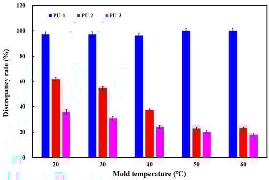 Figure 6 shows the foaming results of three polyurethane foaming agents at five mold temperatures. The simulation results for PU-1 reveal foaming heights of approximately 4.25 mm, 4.25 mm, 5.73 mm, 0 mm, and 0 mm at the respective mold temperatures. For PU-2, the simulated foaming heights were around 60.87 mm, 73.37 mm, 102.15 mm, 126.50 mm, and 126.70 mm, respectively. The third polyurethane foaming agent, PU-3, exhibited foaming heights of approximately 102.36 mm, 112.10 mm, 124.25 mm, 130.98 mm, and 135.40 mm across the same temperature range. The average foaming heights observed in actual experiments for the five mold temperatures were approximately 159.87 mm, 162.37 mm, 163.53 mm, 164.07 mm, and 164.94 mm, respectively. The comparison between the simulation and the experimental results shows that the simulated foaming heights correspond to approximately 35.98%, 30.96%, 24.02%, 20.17%, and 17.90% of the experimentally obtained foaming heights for the respective mold temperatures. Figure 7 shows the discrepancy rate of the foaming height of polyurethane foaming agents obtained from simulation and implementation of three polyurethane foaming agents. The study reveals two significant findings: (a) among the three agents, PU-3 produced simulated foaming heights closest to the actual experimental results at all five mold temperatures, and (b) at a mold temperature of 60 °C, the simulated foaming height for PU-3 was the most accurate, with an error rate of only about 17.90%.