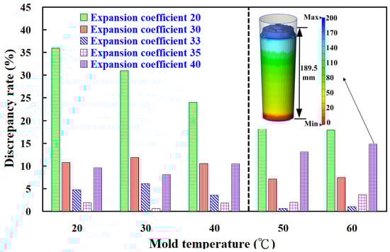 Discrepancy rate of foaming height of polyurethane foaming agent obtained from implementation and simulation using five different expansion coefficients within silicone rubber mold.