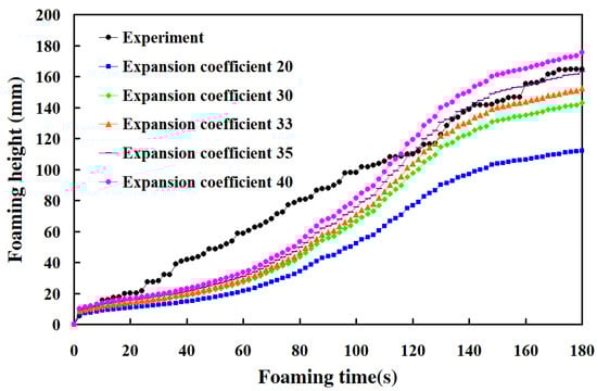 To explore the foam height of the polyurethane foaming agent PU-3 under different expansion coefficients, this study employed five distinct coefficients. Figure 8 presents the simulated foam heights at temperatures of 20 °C, 30 °C, 40 °C, 50 °C, and 60 °C using these coefficients in silicone rubber molds. When utilizing an expansion coefficient of 20, the error rates between the simulated foam heights and experimental values at 20 °C, 30 °C, 40 °C, 50 °C, and 60 °C were approximately 36%, 31%, 24%, 20.1%, and 18%, respectively. For an expansion coefficient of 30, the error rates were around 10.75%, 11.88%, 10.52%, 7.13%, and 7.45%. Using an expansion coefficient of 33, the respective error rates were 4.75%, 6.1%, 3.55%, 0.61%, and 1.03%. With an expansion coefficient of 35, the error rates were 1.94%, 0.62%, 1.83%, 2.01%, and 3.64%. Finally, for an expansion coefficient of 40, the error rates were 9.56%, 8.07%, 10.46%, 13.04%, and 14.85%. The study identified three key findings: (a) expansion coefficients of 33 and 35 yielded simulated foam heights that were closest to the experimental results; (b) for low-temperature foaming at 20 °C, 30 °C, and 40 °C, the expansion coefficient of 35 provided the most accurate foam height simulations for PU-3; and (c) for high-temperature foaming at 50 °C and 60 °C, the expansion coefficient of 33 produced simulations most aligned with the experimental outcomes.