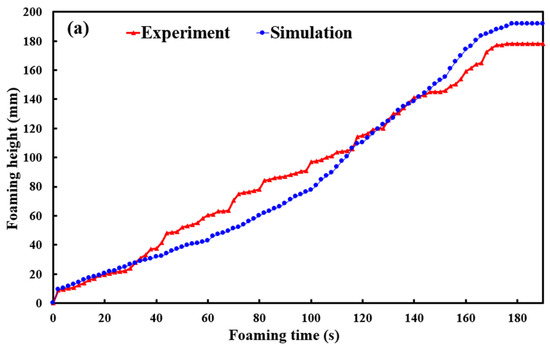 To investigate the impact of various foaming angles on the foam height of polyurethane foaming agents, this study performed simulation foaming tests at a controlled temperature of 30 °C using silicone rubber molds. Four distinct foaming angles, i.e., 30°, 45°, 60°, and 90°, were evaluated to determine their effects on foam height. Based on simulation software, Figure 11 illustrates the relationship between the foam time and height of polyurethane foaming agents at four different foaming angles using simulation software. The simulation results revealed that, within a foaming duration of 180 s, the final foam heights for the respective angles were approximately 191.7 mm, 173.6 mm, 170.4 mm, and 163.4 mm. Analysis of these findings led to the observation of two significant phenomena: (a) a significant correlation exists between the foam height of polyurethane foaming agents and their foaming angle, and (b) the foaming rate is also influenced by the foaming angle. Specifically, a reduction in the foaming angle resulted in a more linear foaming curve, which correspondingly increased the final foam height, whereas an increase in the foaming angle was associated with a deceleration in the foaming rate. Figure 12 shows the relationship between experimental and simulated foaming time and height at four foaming angles of 30°, 45°, 60°, and 90°. The experimental findings indicate that the final foaming heights at angles of 30°, 45°, 60°, and 90° were 178 mm, 167 mm, 166 mm, and 165 mm, respectively. Two significant observations were made: (a) the foaming rate of the polyurethane foaming agent demonstrated consistent linear growth across varying angles; and (b) the simulation software accurately predicted the foaming rate, with strong agreement between the simulated and experimental results at both the initial and final stages of the foaming process.