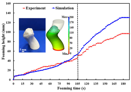Figure 13 shows the accuracy of the simulated foaming heights at different foaming angles. The results indicate that the accuracy rates of simulated foaming heights at foaming angles of 30°, 45°, 60°, and 90° were 92.3%, 96%, 97.3%, and 99%, respectively, with an overall average accuracy of approximately 96%. Two key observations emerged. One is that the accuracy of the simulated foaming height was lower at a foaming angle of 30°. The other is that the accuracy was highest at 90°. This disparity can likely be attributed to the significant influence of gravity on foaming behavior. At a foaming angle of 30°, the polyurethane foaming process becomes more complex, necessitating more sophisticated calculations by the simulation software. In contrast, at a 90° angle, the foaming material primarily experiences vertical gravitational forces [23], resulting in simpler foaming dynamics and consequently higher simulation accuracy. Therefore, a thermal expansion coefficient of 35 can be used in a silicone rubber mold at 30 °C to predict the foaming height of polyurethane foaming agents because the predicted foaming height of the polyurethane agent achieves an average accuracy of 96%. Based on the above experimental results, this study proposes two foaming mechanisms for polyurethane foam components. To further investigate the accuracy of predicting the foaming height of polyurethane foam agents using a silicone rapid mold at 30 °C with an expansion coefficient of 35, this study employed a 3D spiral component for testing. Figure 14 shows the results of the 3D simulation and experimental study on polyurethane foaming agents. In the experiments, the final foaming height reached 97 mm. However, simulations predicted that the foaming height of the polyurethane foam agent could reach 130 mm, with an accuracy rate of approximately 66%. The practical results and simulated foaming curves exhibited two distinct foaming trends. Specifically, the foaming curve displayed a relatively gradual increase from 0 to 105 s, followed by an almost linear growth pattern from 105 to 180 s. Due to the complex geometric structure of the 3D spiral component, the height growth of the foaming material within this space faced greater challenges, resulting in a significant discrepancy between the final simulated foaming height and the practical foaming height. This study observed two phenomena: first, there is a notable difference between the simulated results and the actual final foaming height of the 3D spiral space; second, the simulated and actual foaming curves exhibited considerable similarity.