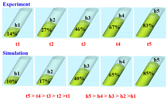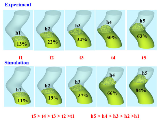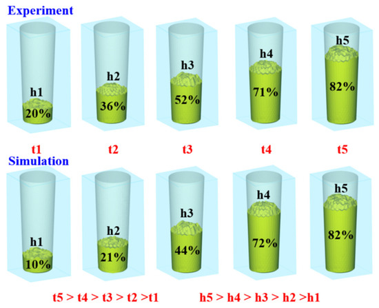 Based on the aforementioned experimental results, this study proposes three mechanisms for the foaming of polyurethane foam components. Figure 15 shows the foaming mechanism of the 2D polyurethane foaming component. As the foam material begins to expand, it progressively rises, leading to a gradual increase in height. During the vertical foaming process, the lower layers of foam are subjected to both the weight and expansion forces of the upper layers due to the influence of gravity. As the expansion continues, the pressure exerted on the lower layers increases accordingly. Observations from actual foaming experiments demonstrate that foam height rises exponentially over time. In contrast, simulation results indicate that the simulated foam heights h1 and h2 are slightly lower than the actual values, while h3 matches the actual height. The simulated height h4 slightly exceeds the experimental result, and h5 is nearly identical to the actual height. Because the foaming mechanism of 2D polyurethane foam is primarily affected by vertical gravitational forces, the process remains relatively straightforward. However, this also means that, among different foaming angles, gravity has the most pronounced impact in the vertical orientation, resulting in the lowest final foam height at 90 degrees. Figure 16 shows the foaming mechanism of the 2.5D polyurethane foaming component. As the foam material begins to expand, it gradually moves upward, leading to an increase in height. During the foaming process at a 60-degree incline, the foam material at the lowest layer, under the influence of gravity, bears the weight and expansion pressure of the upper layers. As the material expands, the pressure exerted on the lower foam layer progressively increases. Observations from the foaming process indicate that the foam height increases geometrically over time. However, simulation results show that the simulated foam heights h1 and h2 are slightly lower than the actual foam height; the simulated height h3 closely matches the actual height; the simulated height h4 slightly exceeds the experimental results, and the simulated height h5 is very close to the actual foam height h5. The foam height at 60 degrees is more favorable for height increase because the 2.5D polyurethane foam specimen no longer expands vertically during the foaming process, and the gravitational effect at a 60-degree incline is less significant than at a 90-degree vertical expansion. Consequently, the final foam height at a 60-degree incline is slightly higher than that at a 90-degree vertical expansion. Figure 17 shows the foaming mechanism of the 3D polyurethane foaming component. As the foaming material begins to expand, it gradually moves upward, leading to an increase in height. During the foaming process in a spiral space, due to the influence of gravity, the foaming material at the lowest layer bears the weight and expansion pressure of the upper layers. As the material continues to expand, the pressure exerted on the lower layers progressively increases. Observations from the actual foaming process indicate that the foaming height rises exponentially over time. However, simulation results show that the simulated heights h1, h2, and h3 are consistent with the actual foaming heights. In contrast, the simulated height h4 is slightly higher than the experimental result, while the simulated height h5 significantly exceeds the actual foaming height. The complex geometry of the helical structure causes the foaming to develop along a curved path, introducing additional resistance and increasing the difficulty of expansion. Consequently, the final foaming heights in the practical experiments differ considerably from the simulated results.