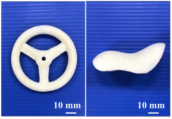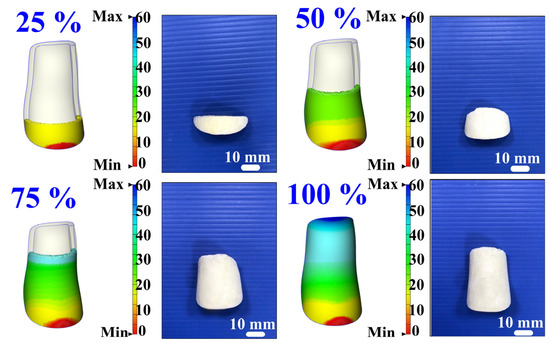 To comprehensively investigate the filling behavior of polyurethane foaming agents in case one, this study performed simulations and experimental comparisons at fill levels of 25%, 50%, 75%, and 100%. Figure 18 shows the simulation and experimental results of validation case one. Both simulations and experiments utilized varying polyurethane foam weights—0.8, 1.75, 2.6, and 3.5 g—to achieve the designated fill levels. The simulation results indicated final foam heights of 14.7, 29.6, 44.3, and 60 mm for the 25%, 50%, 75%, and 100% fill levels, respectively, while the corresponding experimental results yielded foam heights of 10, 21, 33, and 44 mm. For fill rates of 25%, 50%, 75%, and 100%, the calculated accuracy rates were 53%, 59%, 66%, and 64%, respectively. Figure 19 shows the simulation and experimental results of validation case two. Based on the above results, this study identified two phenomena: (a) the foaming height trend of polyurethane foaming agents, as predicted by simulation software, aligns with experimental findings, and (b) the accuracy of foaming height predictions made by the simulation software for validation cases one and two is approximately 60.5% and 64.5%, respectively. Discrepancies between simulation and experimental results may stem from several factors: inaccurate material property parameters [24], improper boundary and initial conditions, limitations in numerical model precision, and coarse mesh division. Material parameters, like viscosity and density, if inaccurately set, may skew outcomes, while mismatches in boundary or initial conditions reduce reliability. Additionally, standard numerical models may inadequately represent non-linear behaviors like exothermic reactions and bubble dynamics. Optimizing mesh refinement and employing advanced models can mitigate these issues. These adjustments, including precise material property calibration, are essential to aligning simulation results closely with experimental data, enhancing predictive reliability. Figure 20 shows the final polyurethane foaming results of verification cases one and two. This study demonstrates that increasing the polyurethane foaming agent to 4 g, as opposed to the 3.5 g used in the simulation, achieves a fully formed polyurethane foaming product in both verification cases one and two. This adjustment highlights the sensitivity of the foaming process to agent quantity, where a 0.5 g increase optimally supports product formation. These findings suggest that precise calibration of the foaming agent amount is critical to achieving complete and consistent results in polyurethane foam production.