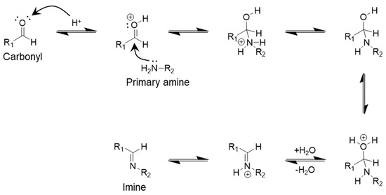 Imine dynamic covalent bonds are among the most commonly introduced dynamic bonds in biopolymer networks. The conditions required for their formation are straightforward and primarily influenced by the pH of the polymer [37]. Imine bond formation is essentially a condensation reaction between an amine group (–NH2) and a carbonyl group (C=O, which may be a ketone or an aldehyde), resulting in the release of water molecules (Figure 2) [38].