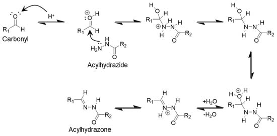 Acyl hydrazone is a dynamic covalent bond formed through a condensation reaction between acyl hydrazide and an aldehyde or ketone (Figure 5). This reaction was first proposed by the Sander group [54]. While similar to imine dynamic bonding, acyl hydrazone dynamic bonds have been shown to be more stable with respect to changes in material pH. The formation of these dynamic bonds is favored at a pH between 7 and 9, whereas the reverse reaction typically requires a strongly acidic pH (below 4) [55,56]. However, their bioapplications are limited. Several factors promote the dissociation of the acyl hydrazone bond, including water concentration, temperature, and the presence of a catalyst.