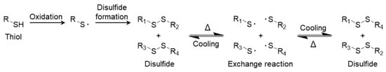 Dynamic covalent disulfide bonds exist between two sulfur atoms in the chemical structure of a material [57,58]. This linkage is formed through the oxidation of thiol groups, where two hydrogen atoms are removed, creating free radical sulfides that can then pair up and bond (Figure 6) [59]. Unlike imine and boronate bonds, disulfide bonds are stable with respect to changes in pH and water content within the material. The reversible reaction of a disulfide bond does not involve complete bond cleavage. Instead, disulfides become unstable upon the input of energy (e.g., heat or UV light). This triggers a disulfide exchange reaction, where a pair of sulfur atoms partially dissociates into free radical sulfur atoms, acquiring high mobility [60,61]. These free radicals can then attack other disulfide bonds, swapping positions. Upon returning to room temperature, the disulfide bonds stabilize and reform randomly, creating new dynamic disulfide bonds. This reaction provides a simple mechanism for self-healing in polymer materials containing disulfide bonds. However, this process is time consuming and requires an external source of heat or UV light.