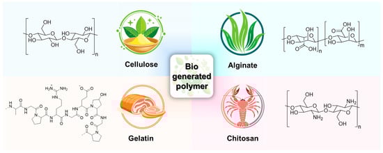 Bio-generated polymers that are collectible from natural sources, including cellulose, alginate, chitosan, and gelatin.