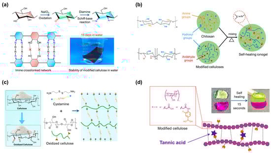 Yin et al. used an oxidation process to synthesize aldehyde cellulose (Figure 9c) [87]. In this study, imine bonds were created with cystamine. Thus, covalent disulfide bonds were introduced into the network. In the disulfide exchange reaction, the polymer network functions as an adhesive material. The author also performed an oxidation process to generate aldehyde groups for imine dynamic bonds while preparing for the application. Instead of cellulose, Ollier et al. proposed a material based on carboxymethylcellulose, which resulted from the introduction of carboxymethyl groups onto cellulose (Figure 9d) [88]. Subsequently, the material was modified with 4-amino-3-fluorophenylboronic acid, which was able to generate boronate ester covalent bonds with tannic acid. Tannic acid also generated hydrogen bonds, which maintained the softness and self-healing ability of the material.