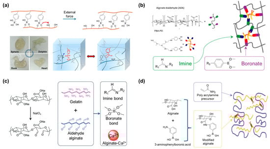 Hong et al. introduced a phenylboronic functional group by modifying alginate via the reaction between the amine of 3-Aminophenyl boronic acid and the hydroxyl group of alginate (Figure 10a) [94]. The reaction occurred in the presence of an N-hydroxysuccinimide/1-(3-(dimethylamino)-propyl)-3-ethylcarbodiimide hydrochloride (EDC/NHS) catalyst, which is well known for its high yield. The functional groups formed dynamic bonds with the remaining hydroxyl groups of the alginate. These bonds were proposed to dissociate and reform the new connection with another hydroxyl group, and the polymer was affected by an external force stimulus. Thereafter, the modulus of the material could be controlled by adding glucose and triggering a dynamic reaction. Shen et al. introduced an alginate-based material containing multiple dynamic covalent bonds (Figure 10b) [95]. First, a portion of the alginate monomer was oxidized with NaIO4 (approximately 10% oxidation degree) to generate aldehyde functional groups, which are the basis for the formation of imine dynamic bonding. On the other hand, a multifunctional crosslinker includes an amine (for imines) and boronic acid (for boronate esters). The structure of the gel material can be tuned by varying the ratio of the functional groups of the crosslinkers. The properties of the material could be further controlled by the introduction of glucose, similar to the mentioned previous research of Zhang et al., who synthesized the oxidized alginate, which forms an imine bond with amine-rich gelatin (Figure 10c) [96]. In this study, boronate ester bonds were formed by the introduction of borax, and Ca2+ formed an egg-box structure. The focus of this study was to investigate the influence of Ca2+ on the mechanical properties of the materials. As the ion concentration increased, the stress at break, strain at break, adhesion, and self-healing ability of the material improved.
