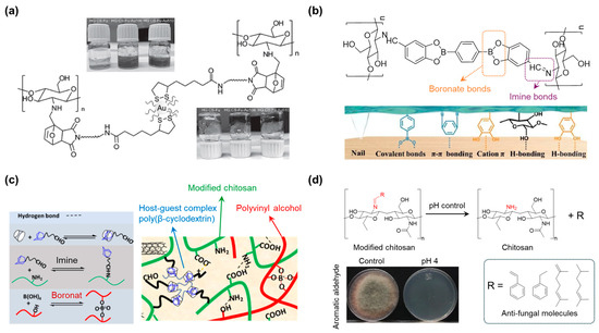 Mozos et al. used dynamic covalent imine bonds to modify chitosan with various antifungal materials (Figure 11d) [106]. Specifically, they induced an increase in antifungal activity by controlling the pH of the imine bond between the antifungal agent and the chitosan chain, which in turn controlled the release of the antifungal agent. The direct binding of the aldehyde-containing materials to chitosan also ensured the mechanical properties of the proposed material.