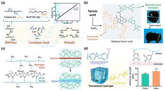 Kang et al. introduced oxidized tannic acid into the gelatin chains to form a network structure (Figure 12b) [113]. Tannic acid, oxidized by NaIO4, undergoes thermal conversion, which gives it antibacterial ability. On the other hand, the modification of tannic acid converts a large amount of the hydroxyl functional groups in the molecular structure to aldehyde, which forms an imine bond with the amine of gelatin. In addition, borax ions are added to the network to form boronate bonds. As a result, gelatin not only has higher stress and strain at break during the tensile test but also has excellent tissue adhesion and self-healing abilities.