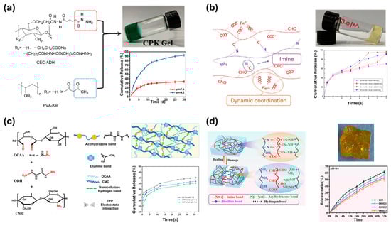 Jiang et al. synthesized ketoester-type acylhydrazone, a variant of acylhydrazone dynamic covalent bonds, between carboxyethyl cellulose and polyvinyl alcohol chains (Figure 13a) [117]. The reversible formation of acylhydrazone bonds can be regulated by pH changes. In an acidic environment, the dynamic crosslinks dissociate, facilitating the release of doxorubicin (DOX). By exposing the DOX-containing sample to different pH conditions, they observed variations in the release rate. While 100% of DOX was released within 30 days in a pH 6.2 buffer, only 34% was released in a pH 7.4 buffer. On the other hand, Gou et al. formed imine bonds between oxidized hyaluronic acid and glycol chitosan with FeCl3 incorporation (Figure 13b) [118]. Two factors control the degradation of the hydrogel: acid promotion and the presence of Fe3+. Compared to the pristine sample, the sample containing Fe3+ exhibited a higher release rate. These results further demonstrate the enhanced ability to control the release rate of dynamic covalent bond-based polymer materials.