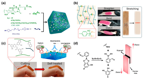 (a) The alginate-based multiple dynamic functions polymeric hydrogel crosslinked by boronate covalent bond [94]. Copyright 2018, American Chemical Society. (b) The dual dynamic covalent crosslinked network of boronate and imine for the application of antibacterial materials [95]. Copyright 2022, American Chemical Society. (c) A highly hydrophilic Ca2+-contained three-dimensional network with a large amount of water [96]. Copyright 2020, Royal Society of Chemistry. (d) Smart hydrogel with multiple functionalities with three categories of stimulus [97]. Copyright 2018, John Wiley and Sons.