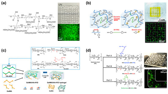- Wang, Y.; Chen, Y.; Zheng, J.; Liu, L.; Zhang, Q. Three-Dimensional Printing Self-Healing Dynamic/Photocrosslinking Gelatin-Hyaluronic Acid Double-Network Hydrogel for Tissue Engineering. ACS Omega 2022, 7, 12076–12088. [Google Scholar] [CrossRef] [PubMed]