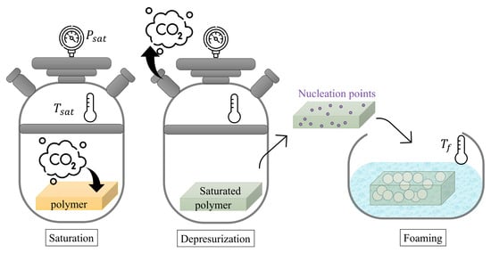 Later, the cellular materials were produced through gas dissolution foaming with the following conditions: saturation pressure of 50 MPa, saturation temperature of 60 °C, foaming temperature of 90 °C, and foaming time of 90 s. In this methodology, as can be seen in Figure 2, pressurized CO2 is dissolved into a polymer matrix under carefully controlled pressure and temperature conditions to promote pore generation upon depressurization. The abrupt pressure reduction creates a state of thermodynamic instability, triggering the formation of small nuclei. These nuclei can then expand into pores when the polymer matrix is heated to temperatures exceeding its effective glass transition temperature.