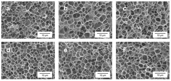 SEM micrographs of the cellular structures of (a) pure PMMA, (b) 0.5 wt. % content of nanoplatelets (c) 1 wt. % content, (d) 2 wt. % content, (e) 5 wt. % content, and (f) 10 wt. % content.