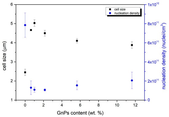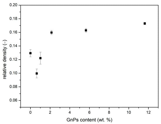 As indicated in Figure 5, the relative densities vary in the range of 0.1–0.2. When adding a 0.5 wt. % of GnPs, density is reduced compared to the pure material, from 0.13 to less than 0.10. However, this relative density increases with the content of GnPs up to a maximum value of 0.17 for 10 wt. % of added GnPs. This rising tendency can be explained by the differences in the cell nucleation density and cell sizes, as described in Equation (4) [29]: