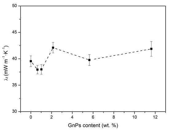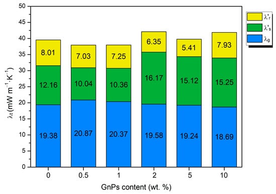 The second term that mostly contributes to the thermal conductivity is the solid conduction. The solid phase conduction tends to increase for higher contents of nanoparticles, especially from 2 wt. %. This increasing tendency is due, on the one hand, to the increasing relative density with the GnP content (Figure 5) and, on the other hand, to the higher thermal conductivity of GnPs in comparison to PMMA; as the nanoplatelet content increases, grows as well since both parameters are directly proportional.
