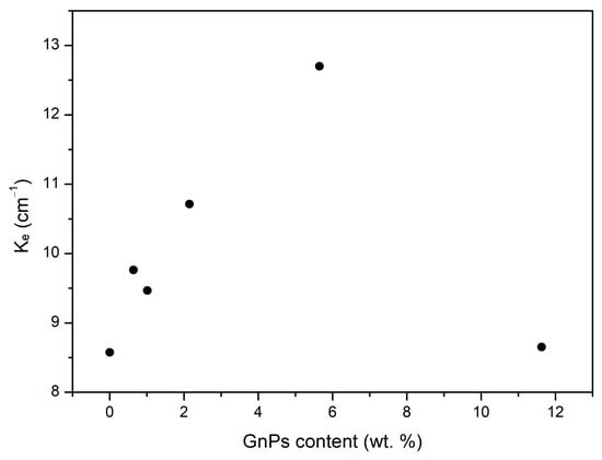 From the radiative term values, it is possible to calculate the extinction coefficients . This extinction coefficient is represented in Figure 8, which is inversely proportional to the radiative term, showing again that the added particles efficiently reduce infrared radiation. The highest coefficient is obtained for the sample with the lowest radiative contribution, which is for the 5 wt. % content of graphene nanoplatelets.