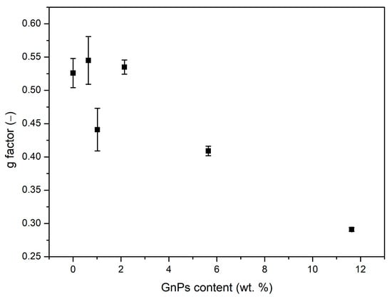 Although the solid term has been proven to be higher than that of PMMA for high contents of GnPs, it is worth mentioning that samples with 0.5 and 1 wt. % of GnP present smaller values of than pure PMMA, even when their density is not smaller. So as to understand this result, the structural factor (g) has been calculated by Sánchez Calderón’s method [28]. As illustrated in Figure 9, g is diminished compared to pure PMMA, notably for high contents of GnPs. So, although the thermal conductivity of the solid matrix increases due to a high thermal conductivity of GnPs, their presence reduces g factor.