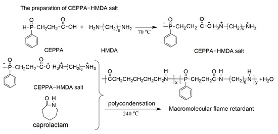 - Chen, X.; Xu, D.; Zhang, H.; Feng, X.; Deng, J.; Pan, K. In situ polymerization of flame retardant modification polyamide 6,6 with 2-carboxy ethyl (phenyl) phosphinic acid. J. Appl. Polym. Sci. 2019, 137, 48687. [Google Scholar] [CrossRef]