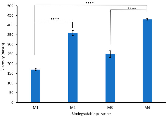 Figure 3 shows that increasing the PVA content from 3 to 6% increased the viscosity of the biodegradable polymers (CS/PVA/S) from 170 to 360 mPa-s. This increase in viscosity is due to the flexibility and hydrogen bonds between PVA, CS, and S [38]. However, mixing CS/PVA/S at a ratio of 1/3/6 with carbon black (M3) increased the viscosity of the biodegradable polymer from 170 mPa-s to 250 mPa-s, whereas mixing CS/PVA/S at a ratio of 1/5/4 (M4) increased the viscosity of the biodegradable polymer from 360 mPa-s to 430 mPa-s. Generally, the viscosity of the polymer is influenced by different factors, including temperature, additives, the structure of the polymer, and functional groups [39].