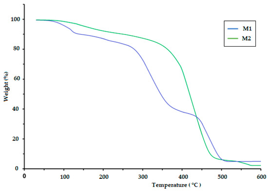 TGA thermogram of the biodegradable polymers CS/PVA/S (M1 and M2).