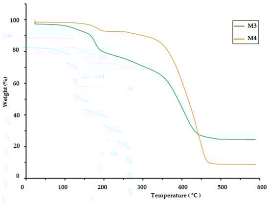 TGA thermogram of the biodegradable polymers CS/PVA/S mixed with rice straw and carbon black (M3 and M4).