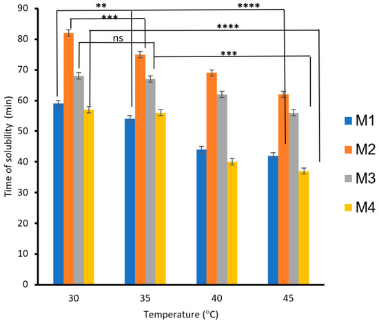The effects of PVA, S, carbon black, and rice straw on the solubilities of the blended biodegradable polymer films, the films mixed with carbon black (M3), and the films mixed with rice straw as a function of time and temperature are shown in Figure 6. The results showed that the solubility of the biodegradable polymers increased as the temperature increased from 30 to 45 °C. The biodegradable polymer based on 3% PVA (M1) decreased the solubility time by 28%, whereas 6% PVA (M2) decreased the solubility time by 24%. However, adding carbon black to the biodegradable polymer M1 decreased the solubility time by 17% (M3), whereas adding rice straw to the biodegradable polymer M2 decreased the solubility time by 35% (M4). The decrease in solubility time is due to the role of rice mixed with CS/PVA/S, which increases the solubility of the biodegradable films with water more than the role of carbon black.