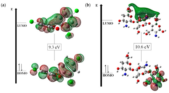 HOMO–LUMO frontier molecular orbitals for (a) triclosan (TCS) and (b) chitosan (CHT).