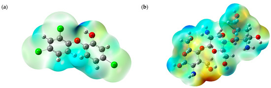 Molecular electrostatic potential for (a) triclosan and (b) chitosan.