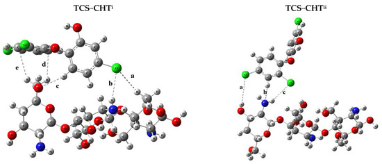 Structural configurations of the systems formed between triclosan and chitosan: TCS...CHTi, TCS...CHTii, TCS...CHTiii, TCS...CHTiv, and TCS...CHTv.