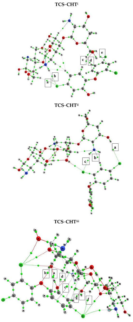 The quantum theory of atoms in molecules was developed by Bader and uses topological properties to describe the electronic structure of molecules [33,34]. The QTAIM allows the identification of the bond critical point (BCP), which helps determine whether there is an interaction or chemical bond. Its topological properties enable the evaluation of the interaction strength and its character, providing insights into the electronic level of the systems [33,34]. In this context, the QTAIM was used to evaluate the interactions, and the molecular graphs generated, along with the respective critical bonding points between TCS and CHT, are represented in Figure 4. The values of the topological parameters found are shown in Table 3.