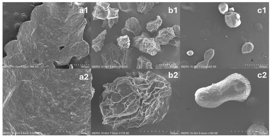 The surface textures of the capsules dehydrated by three methods—oven drying (a1, a2), freeze-drying (b1, b2), and critical point drying (c1, c2)—are shown in Figure 5. The oven-dried capsules (a1, a2) exhibit an elongated and flat morphology with small agglomerates; while the polymeric matrix is partially preserved, the collapsed structure suggests significant disruption, making it unclear whether the enzyme remains entirely encapsulated or partially released. In contrast, the freeze-dried capsules (b1, b2) maintain their shape but an apparent shrinkage is observed, with grooves formed during dehydration; thus, these structural disruptions could indicate potential pathways for enzyme release, although this cannot be directly confirmed from the image alone. Lastly, the critical point-dried capsules (c1, c2) retain a spherical and uniform structure, with minimal deformation and no visible grooves, demonstrating that this method better preserves the structural integrity of the samples. This suggests that critical point drying is the most efficient method for preserving the original morphology.