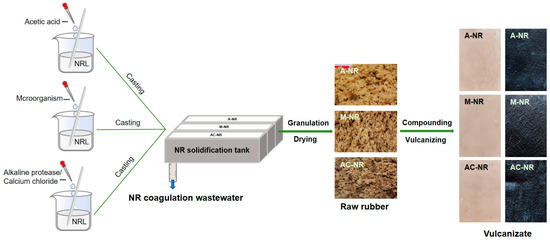 Natural rubber latex was collected in rubber forests, and the dry rubber content of natural rubber latex (approximately 33–39%) was measured and uniformly diluted to 23%. The initial pH at the isoelectric point of the natural rubber latex was measured and adjusted to neutral, and the natural rubber latex was subsequently coagulated by different coagulation processes. Acetic acid-NR (hereafter referred to as A-NR) was obtained by adding appropriate amounts of acetic acid to the natural rubber latex and mixing uniformly; microorganism-NR (hereafter referred to as M-NR) was obtained by adding appropriate amounts of microbial bacterial liquid to the natural rubber latex. Alkaline protease/calcium chloride-NR (henceforth referred to as AC-NR) was obtained by adding 0.07% alkaline protease and 0.1% calcium chloride to natural rubber latex with homogeneous mixing. The process of natural rubber sample preparation is shown in Figure 2. After the latex had completely solidified, the rubbers were placed in a coagulation tank for 1 day. The wastewater in the three coagulation tanks was extracted to measure the pH at the isoelectric point, and then solidified. The solidified rubber samples were pressed five times, crushed, dried at 110 °C, and extruded to obtain raw rubber blocks, which were mixed. These samples were then subjected to various compounding agents (formulations as shown in Table 2) in the open roll mill, in accordance with the prevailing operating standards [9]. The vulcanization process was then initiated in the vulcanizing machine at 140 °C, yielding vulcanized rubber samples of pure rubber/carbon black formulation.