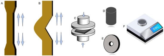 (A) Schematic of tensile strength test. (B) Schematic of tear strength test. (C) Schematic of RPA test of dynamic mechanical properties. (D) Schematic of DIN abrasion sample. (E) Schematic of Akron abrasion sample. (F) Schematic of the DSC instrument.