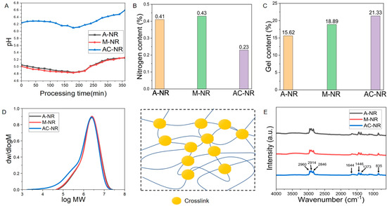 (A) Trends in pH at the isoelectric point during the coagulation of NR. (B) Nitrogen content of NR. (C) Gel content of NR. (D) Molecular weight distribution of NR. (E) Infrared spectra of NR.