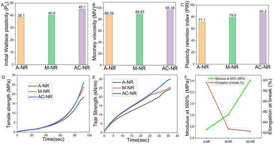 (A) Initial plastic value P0 of NR. (B) Mooney viscosity of NR. (C) Plasticity retention index (PRI) of NR. (D) Tensile strength of NR. (E) Tear strength of NR. (F) Comparison of trends in elongation at break and 500% modulus of NR.