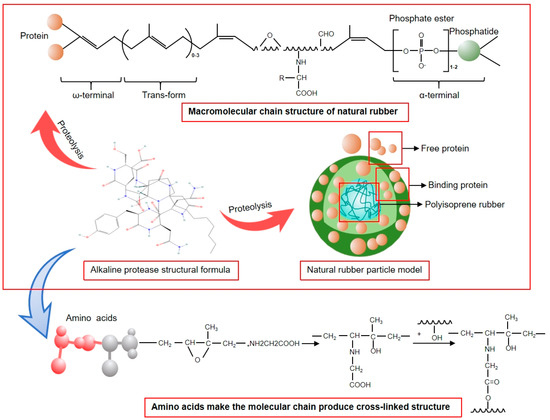 As demonstrated in Figure 5F, the modulus at 500% and the elongation at break of A-NR, M-NR, and AC-NR exhibited a close correlation with the network-like structure of rubber hydrocarbon linear polymers, which were formed by cross-linking following the vulcanization of natural rubber [36]. Furthermore, an inverse proportional relationship was observed between these two parameters. The modulus at 500% of AC-NR and M-NR were 3.41 MPa and 3.21 MPa, respectively, which were higher than that of A-NR [37]. Figure 6 illustrates the potential mechanisms through which alkaline proteases enhance the overall properties of natural rubber. With the increase of cross-link density, constant tensile stress increased, which indicates that AC-NR vulcanized rubber built more network structures to resist external deformation, but there was a partial loss of resilience and increased permanent deformation of AC-NR vulcanized rubber, and the elongation at break was at the normal level, although slightly lower.