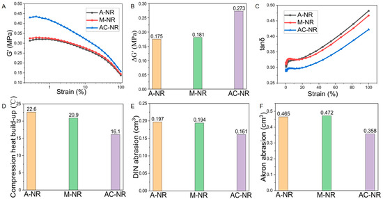 (A) Elastic modulus G′ of NR. (B) Payne effect of NR. (C) Dielectric loss factor tanδ of NR. (D) Final temperature rise of NR. (E) DIN abrasion of NR. (F) Akron abrasion of NR.