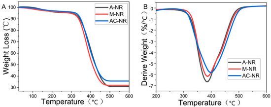 (A) Thermogravimetric curve of NR. (B) DTG curve of NR.