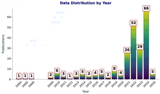 Figure 1. Year-wise distribution of publications featuring “SVR”, “SVM”, and “polymers” in title or abstract.